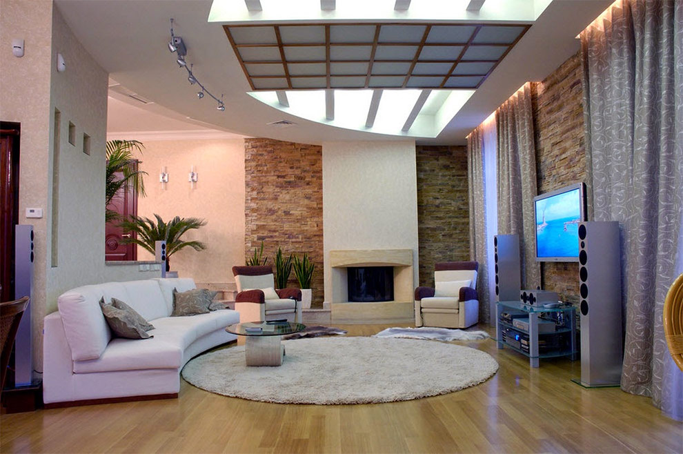 Pour que l'aspect final de votre salon réponde à vos attentes, vous devez tout d'abord choisir une pierre. Il peut s'agir de couches entières, de dalles, de pierres de rivière relativement petites, de pavés, de briques. La pierre de construction livrée, quel que soit le type que vous choisissez, peut varier dans une large gamme de formes et de nuances, qui fonctionnera avec presque toutes les palettes de couleurs de l'intérieur.