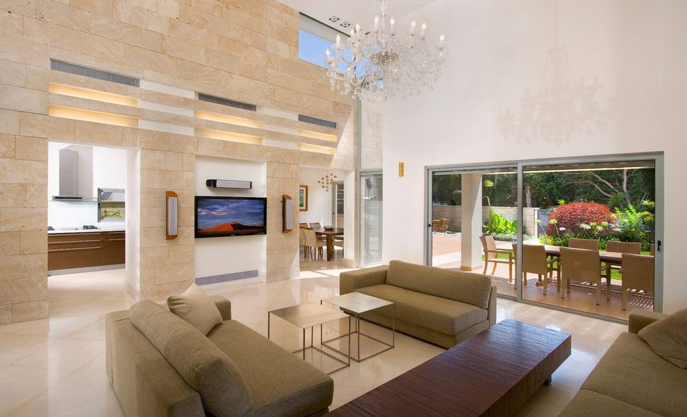 Dans ce salon moderne, un mur de calcaire clair contraste avec la couleur café de la promenade. Le propriétaire de la maison a choisi un tapis de discrètes couleurs claires neutres, afin de ne pas distraire l'attention du mur de pierre qui domine cet intérieur.