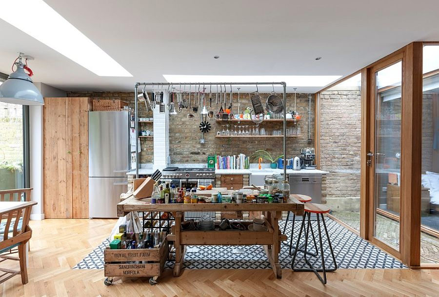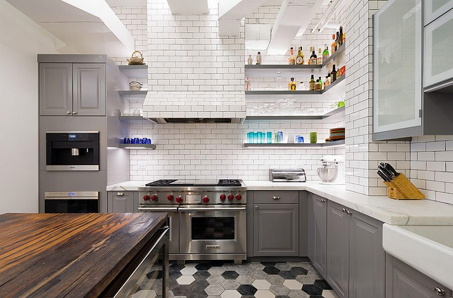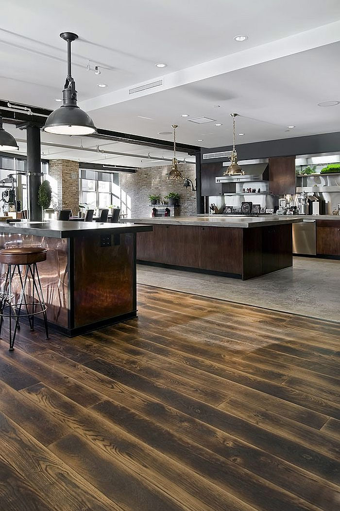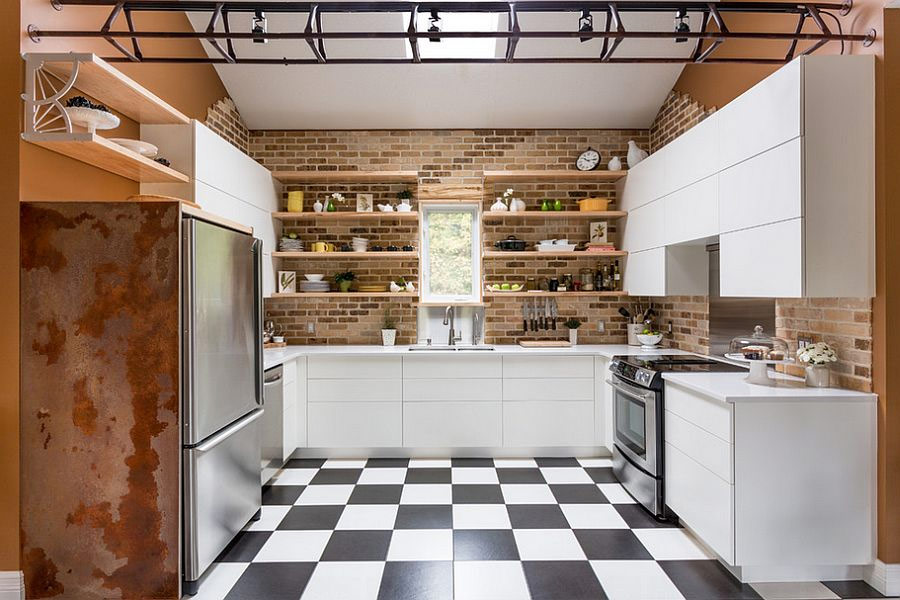 Vous ne pouvez pas compter les options de revêtement de sol - du parquet agencé avec des «chevrons» ou des «chevrons» aux planchers de couleur foncée qui donnent à la cuisine industrielle un look vraiment vintage. Couvrez le tablier de carreaux de brique, accrochez plusieurs étagères ouvertes et votre cuisine est devenue encore plus charmante.