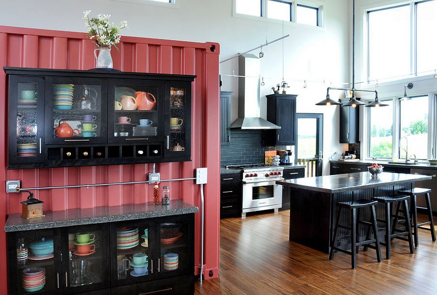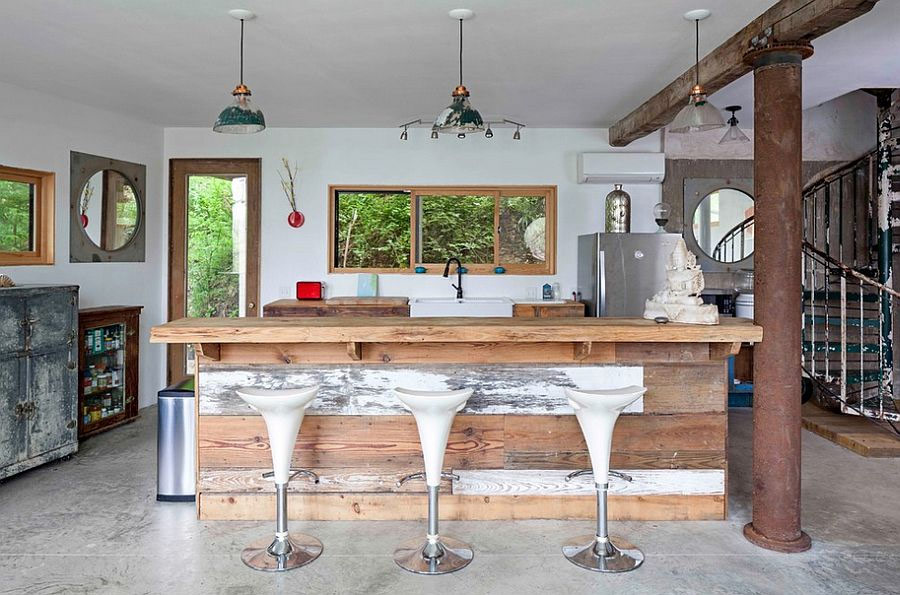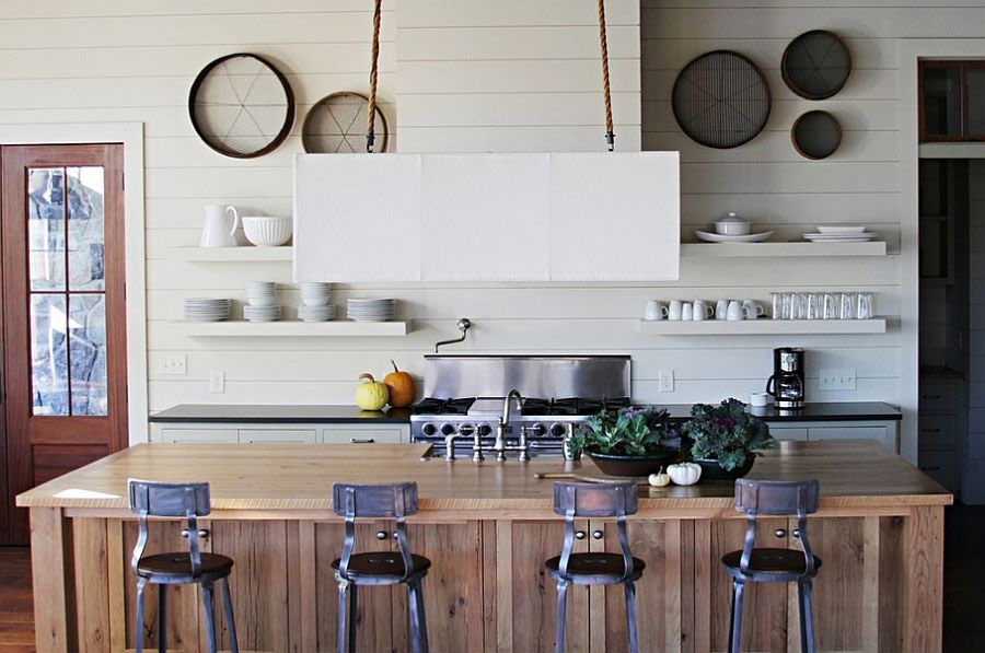 Des tabourets de bar, des lumières inhabituelles et un tableau noir donnent à la cuisine un contraste de texture incroyable (de Bailey General Contracting).