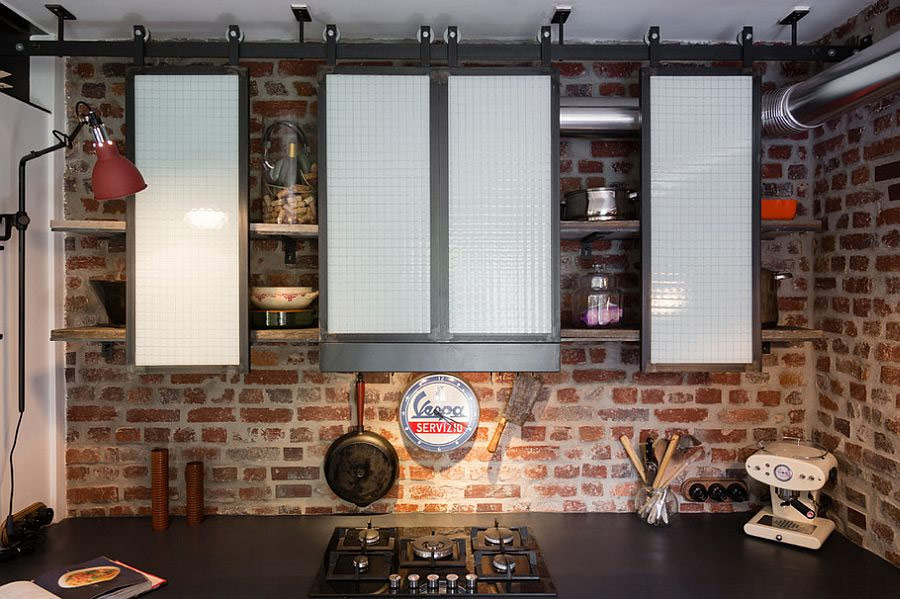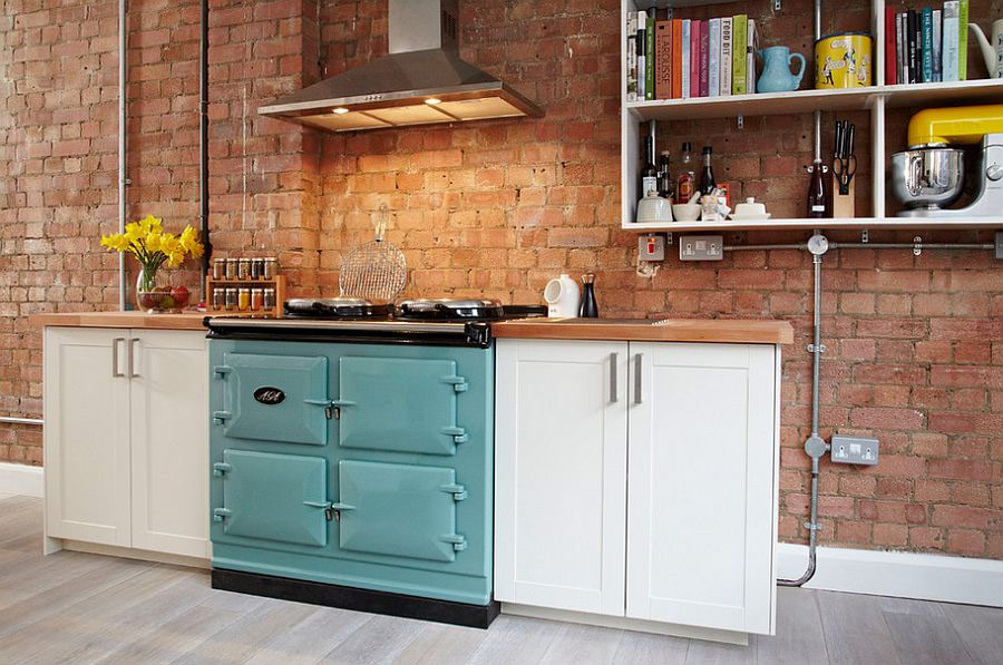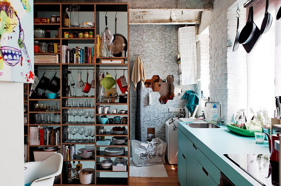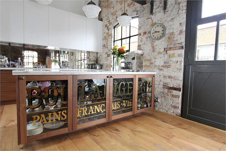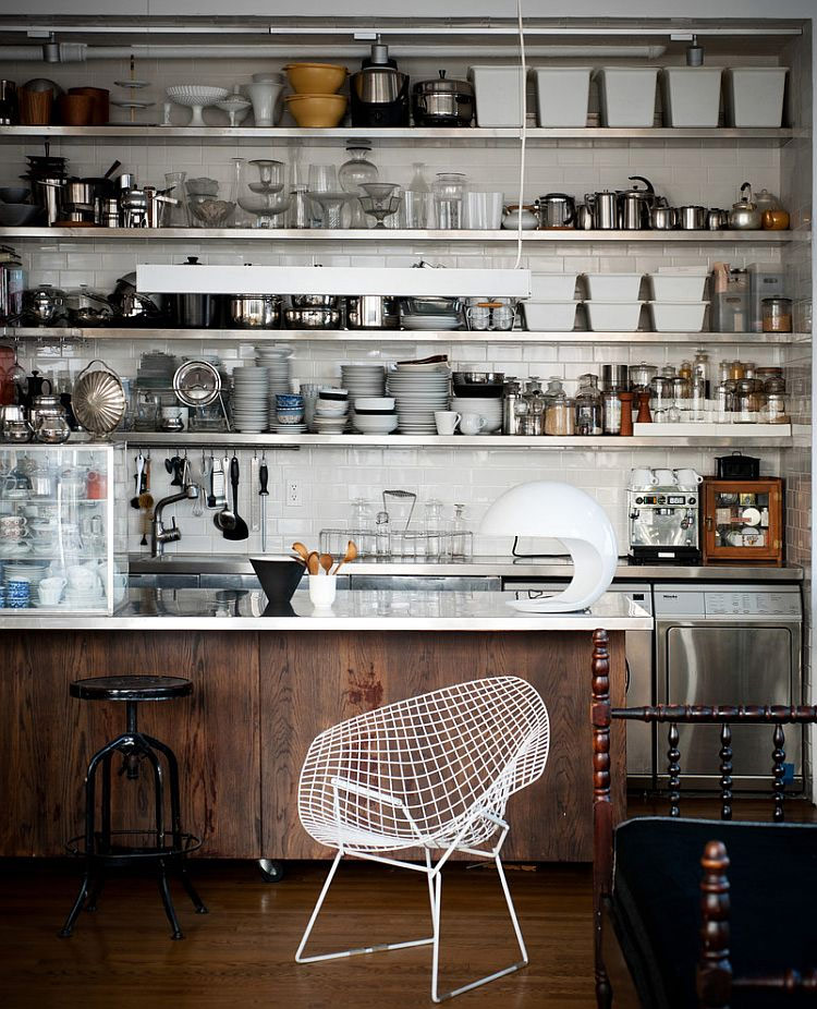 Les étagères ouvertes sont un autre excellent moyen d'apporter la beauté d'un style loft à votre cuisine tout en élargissant l'espace de stockage disponible. Mais n'oubliez pas que la grille devrait créer une sensation de grossièreté naturelle, et si vous avez un ensemble de cuisine moderne, des étagères en bois brut ou en acier inoxydable créeront le contraste nécessaire. Les étagères de cuisine, les étagères à vaisselle antiques et les armoires sur pied vous permettront d'utiliser pleinement l'espace disponible et de maximiser l'espace libre même dans la plus petite cuisine.