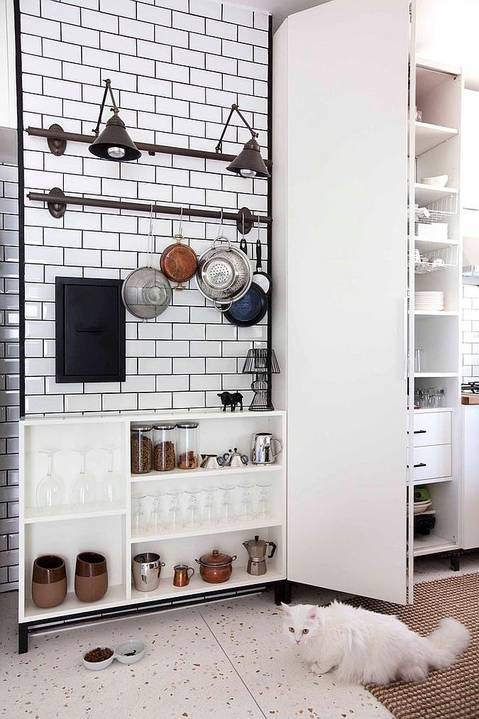 Des étagères à vaisselle qui facilitent l'accrochage de tous vos ustensiles de cuisine, des étagères qui enlèvent tous les plans de travail inutiles et résistants à l'usure se réunissent pour créer un espace de cuisson petit mais pratique et, surtout, très attrayant et élégant.