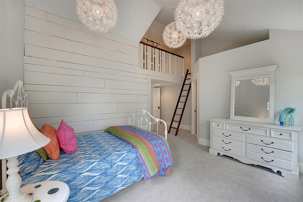 De grands rideaux blancs donnent un attrait visuel doux à cette chambre en mezzanine (de Croissant construit).