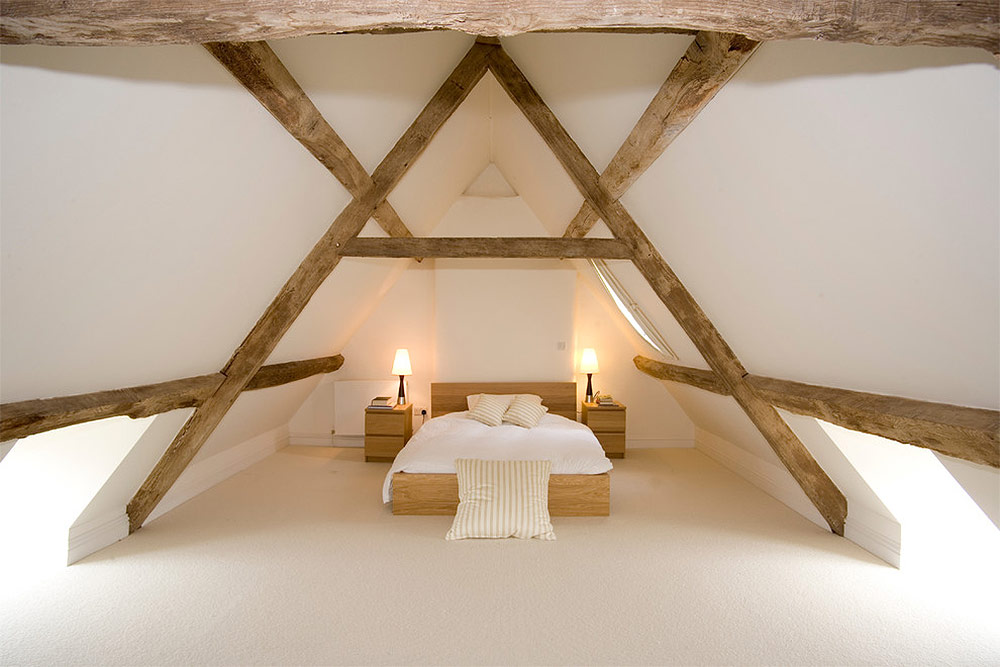 Chambre en mezzanine avec de hauts plafonds, des poutres en bois et une décoration basse (de Laura dante).
