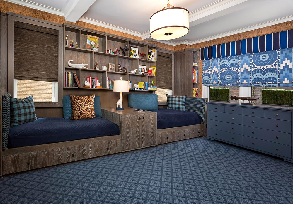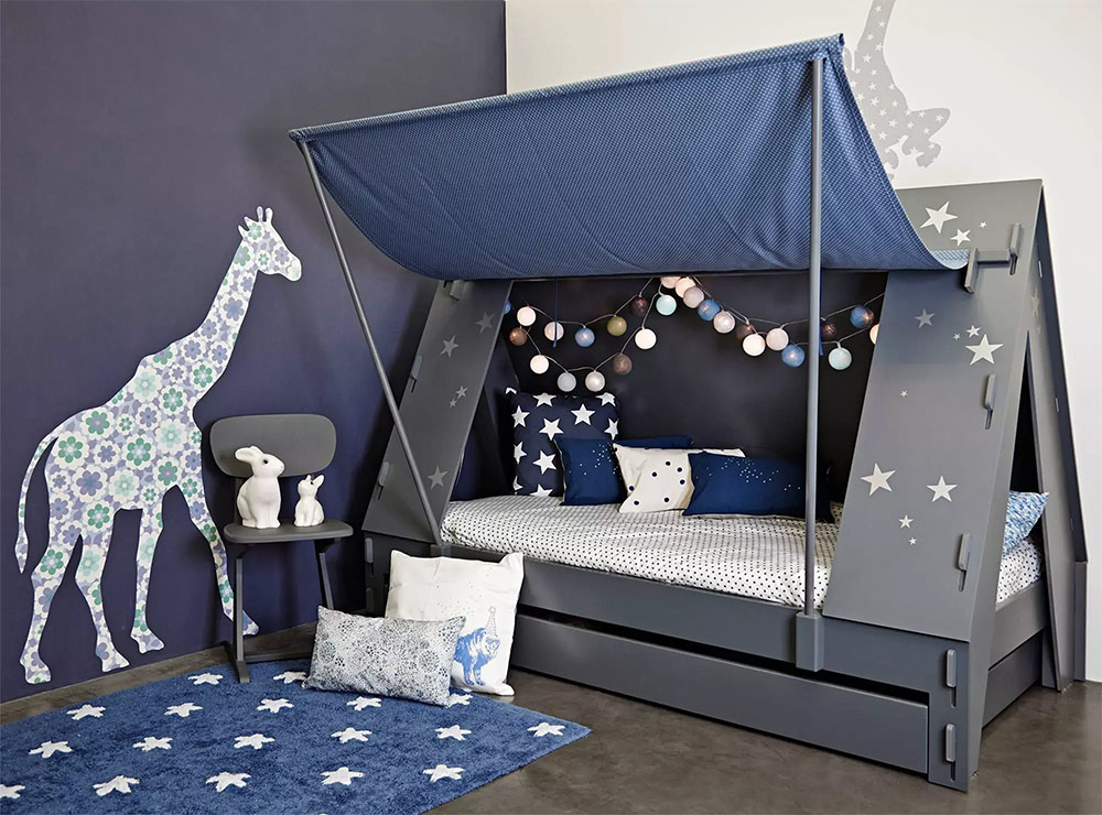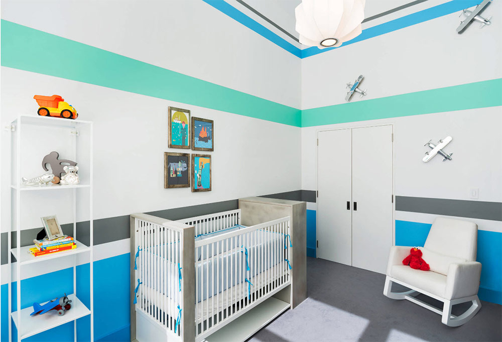 Le bleu est une couleur qui ne vous laissera tout simplement pas vous tromper en ce qui concerne la conception d'une chambre d'enfant pour un garçon. Toutes sortes de nuances de bleu vont bien avec différents thèmes.Par exemple, vous pouvez utiliser des nuances douces de bleu en combinaison avec du blanc pour créer un intérieur rafraîchissant associé à la mer. Ajoutez quelques coraux et éventuellement une planche de surf, et vous obtenez une chambre de garçon avec un look clair et fini.