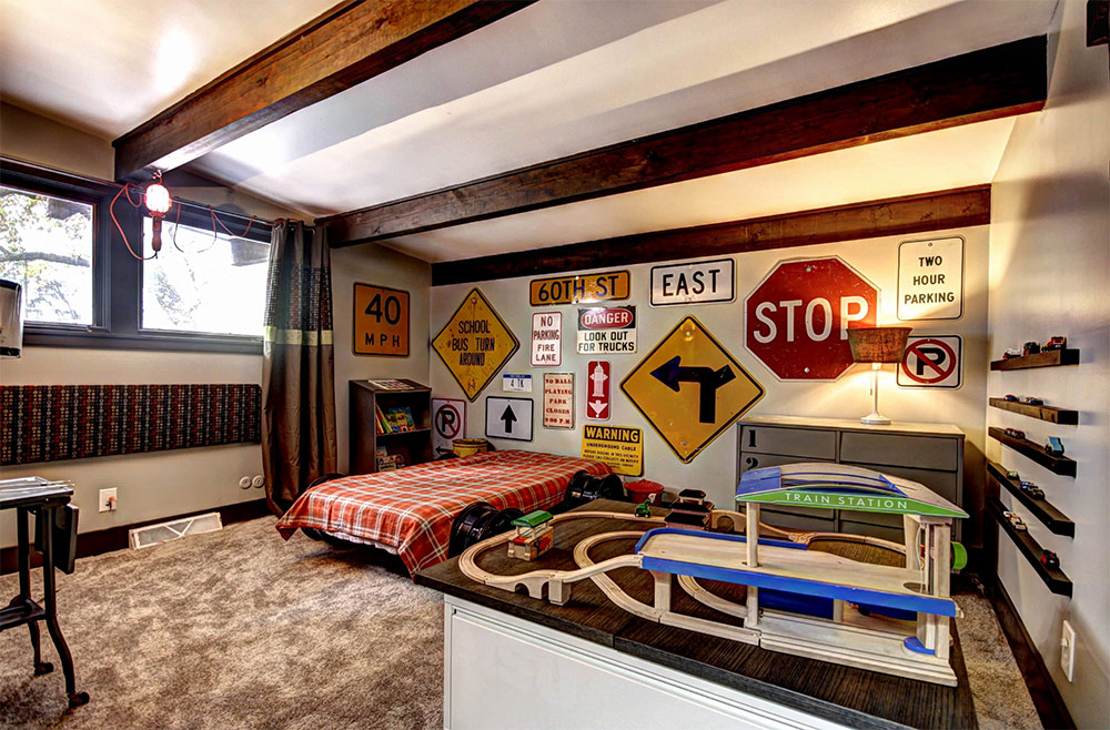 Utilisez de la peinture pour ajouter des touches supplémentaires complexes à la chambre des enfants. Ce sont ces petites choses qui rendent la pièce spéciale et unique. La peinture murale créative et les panneaux muraux originaux sont un excellent moyen de créer un thème pour la décoration, de souligner le style et la sophistication de l'intérieur. Peignez les armoires en vert et accrochez une grande image d'un tableau de bord sur le mur, et voici la place pour un petit fan de baseball. Vous pouvez utiliser les couleurs de son équipe de football ou de basket-ball préférée pour créer un espace inspirant dont votre fils tombera instantanément amoureux. Il s'agit d'une approche inventive et créative!