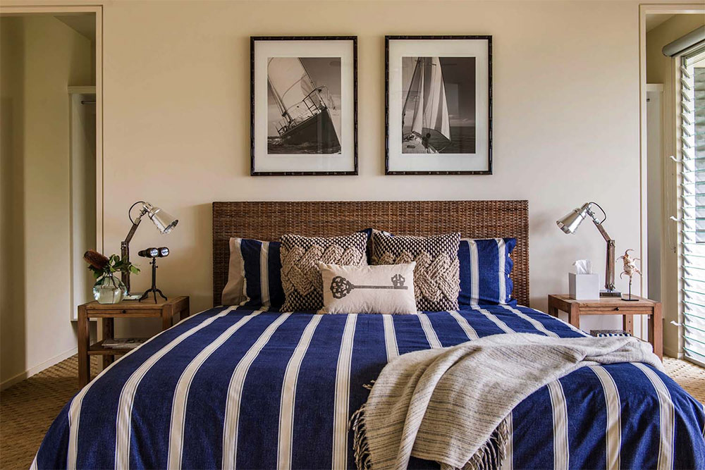 Les murs à rayures bleues et blanches ajoutent de la sophistication à cette pièce.