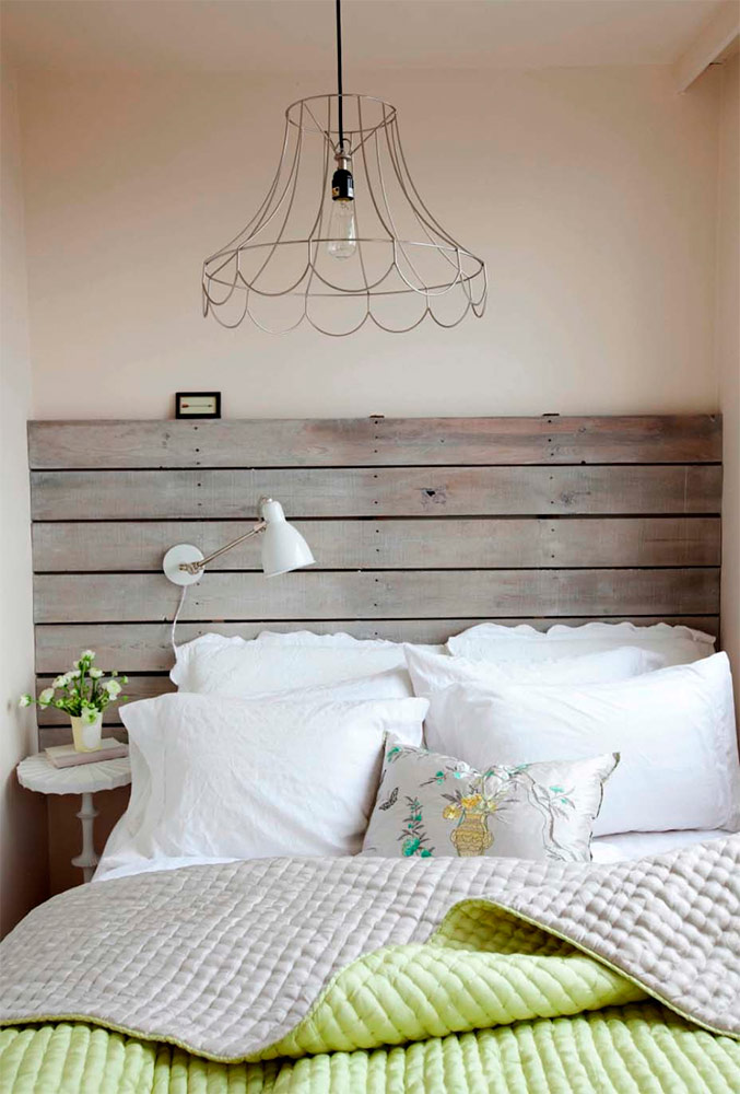 La tête du lit est l'un de ces éléments qui ont une grande influence sur l'apparence de l'intérieur et donnent souvent le style au reste de la chambre. Les têtes de lit qui se présenteraient harmonieusement dans une chambre décorée dans le style du shabby chic peuvent être très diverses. Souvent, à ce titre, ils utilisent de vieux panneaux de bois, un volet ou une porte de grange qui, semble-t-il, ont déjà servi leur âge. Faire une telle tête de lit est assez facile si vous avez réussi à trouver l'une de ces vieilles portes. Il suffit d'enlever toutes les couches de peinture existantes et de la peindre en blanc - vous obtiendrez une tête de lit exquise qui correspond au style choisi.