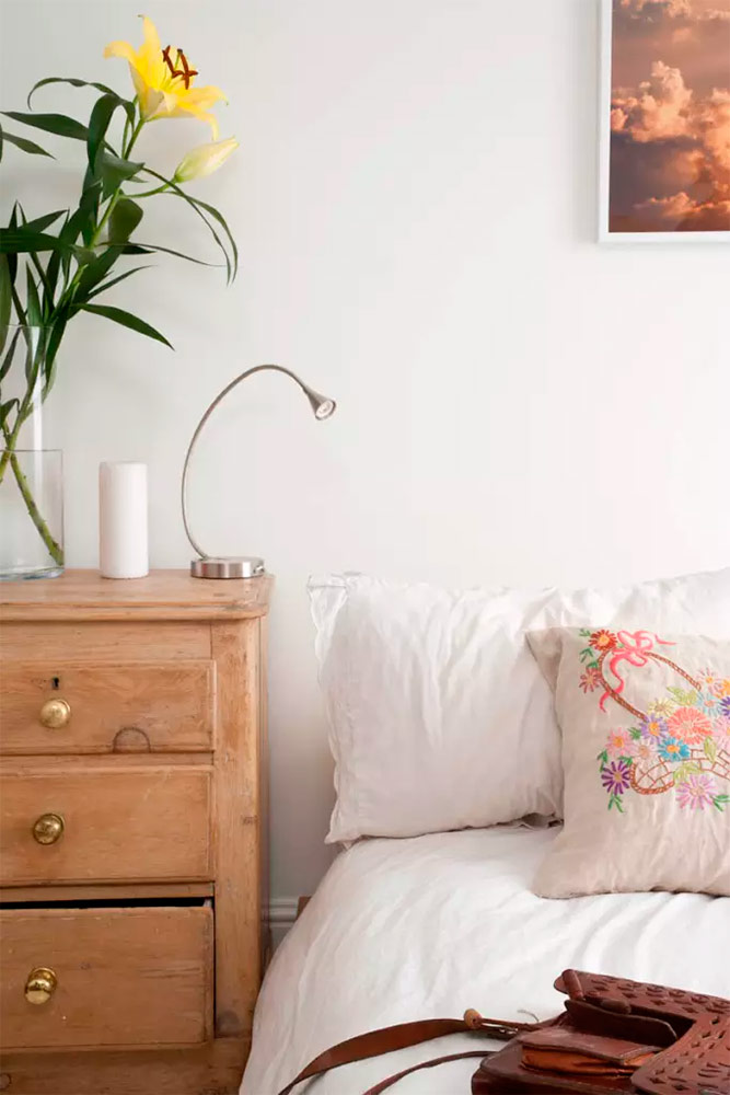 Une vieille chaise, une porte vintage et une belle lampe donnent le style dans la zone de chevet (de Blancs rêveurs).