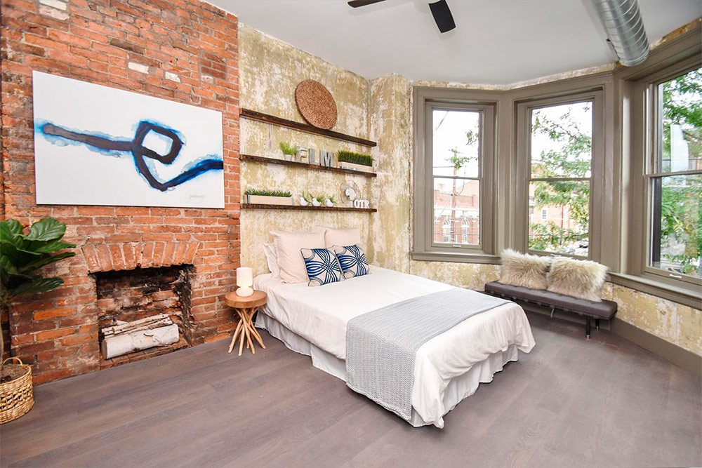 Si la chambre est entourée de murs de briques de tous les côtés, brisez cette monotonie avec des armoires, de grands miroirs ou même des œuvres d'art placées au hasard au sol qui détourneront votre attention. Cela détruira l'aspect fatigant des murs de briques continus et créera une atmosphère d'élégance et de confort dans la chambre.