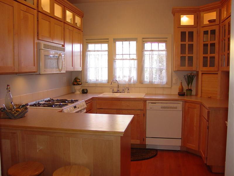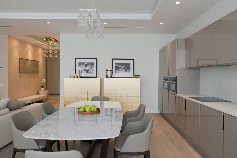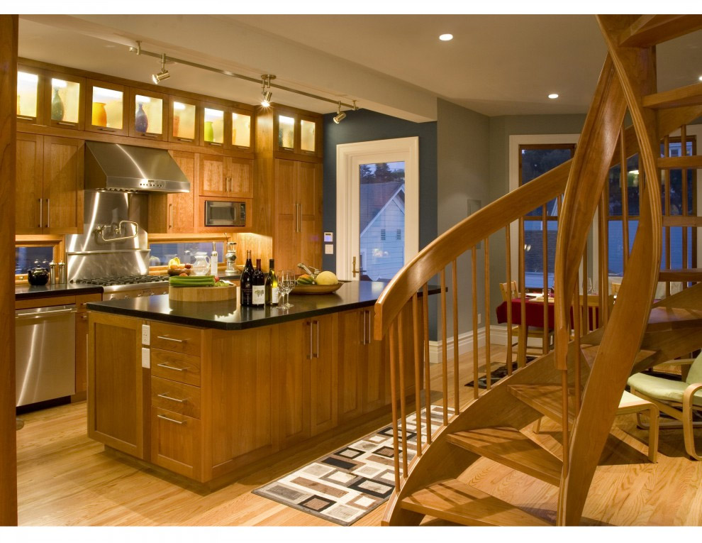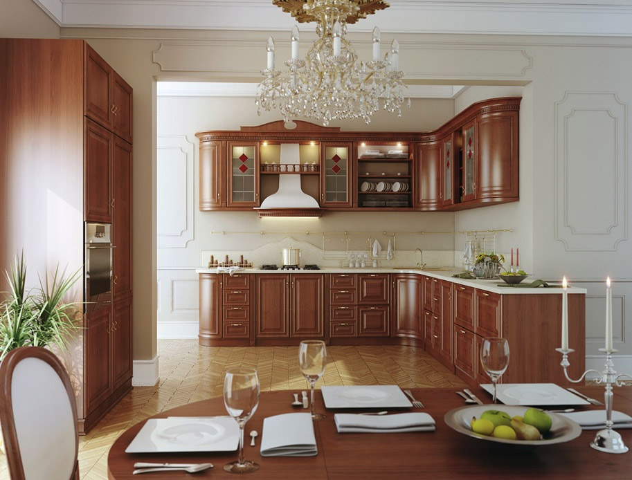 Dans les armoires à portes vitrées, les luminaires sont souvent intégrés, ce qui constitue un éclairage supplémentaire dans la cuisine. Les étagères, illuminées par de petites ampoules mignonnes, reflétant le charme et la beauté des services ou du cristal qui s'y trouvent, créent une sensation de confort et de confort, donnant à la cuisine un look inhabituel.