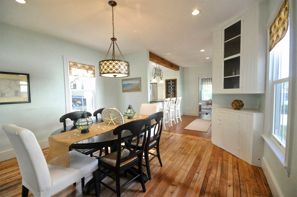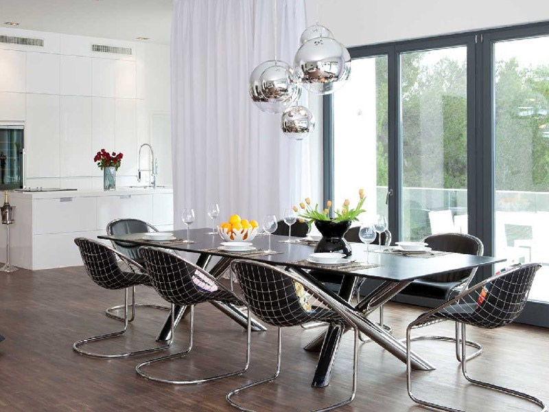 Pour créer une atmosphère agréable dans la salle à manger, il est important de choisir une lampe qui s'intégrera à l'intérieur et rendra en même temps un repas à la table de la cuisine confortable. Au dessus de la table, qui est gratuite, il est préférable de placer une seule lampe avec un réglage en hauteur, elle peut s'abaisser ou s'élever selon votre envie.