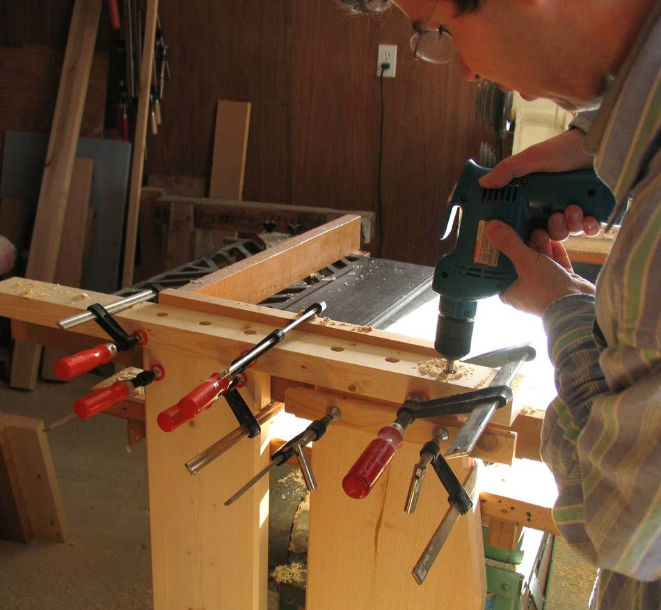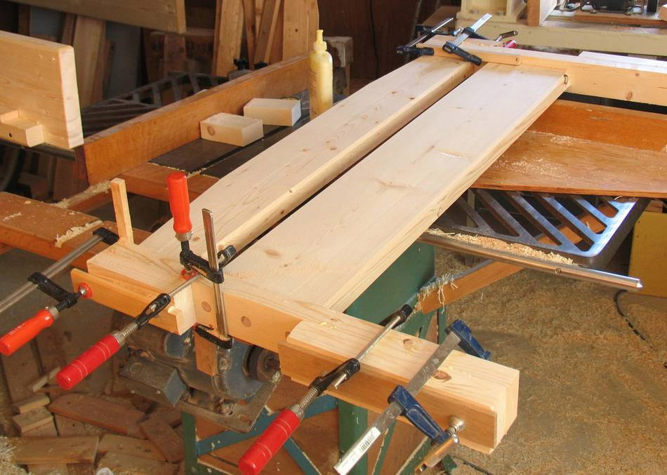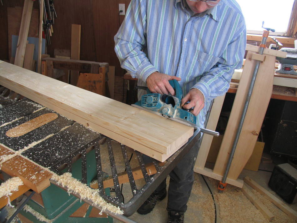 Bien que le bois de construction soit livré raboté, la qualité de leur traitement préalable à la vente n'est pas suffisante pour les projets de mobilier. Comme, comme je l'ai déjà dit, j'ai temporairement perdu certains de mes outils, dont une raboteuse et une dégauchisseuse, la raboteuse électrique s'est avérée être la plus adaptée à mes besoins. En un seul passage, il choisit une largeur ne dépassant pas 7 à 8 cm, donc plusieurs passes parallèles sont nécessaires pour traiter des planches plus larges. En conséquence, certaines irrégularités entre les «pistes» sont restées sur certaines planches, que j'ai cependant facilement éliminées à l'aide d'une rectifieuse.