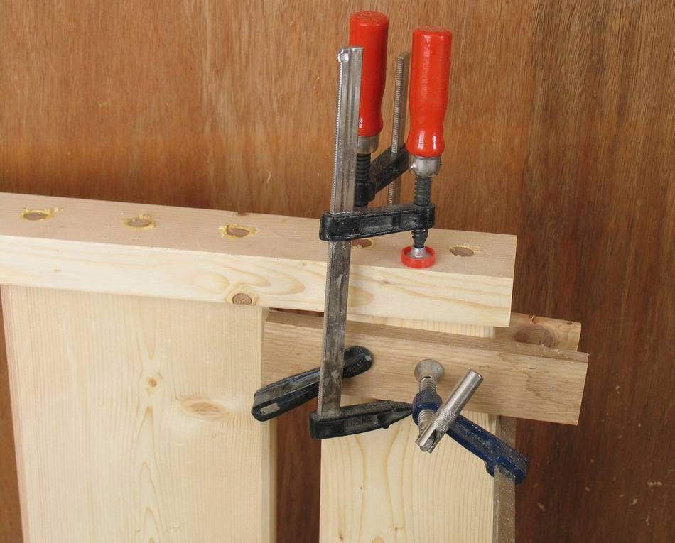 Les éléments horizontaux des dossiers sont reliés aux pieds par 15 mm avec des épingles de meubles en bois. Dans ce cas, une seule (interne) des deux planches de 5x15 cm formant la jambe est impliquée. Avant de percer des trous pour les broches, j'ai fermement fixé les deux éléments fixés avec des pinces et foré les deux pièces à la fois. Cela garantit que les trous sont exactement opposés, tout écart est exclu.