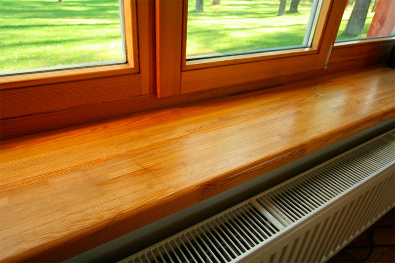 Lors du choix de cette option pour organiser l'espace de la fenêtre, tout d'abord, il est nécessaire de faire attention aux espèces de bois à partir desquelles le rebord de la fenêtre sera fabriqué. Les plus fiables sont les massifs de chêne, d'érable, de châtaignier, de frêne et d'acajou. Il existe des options plus simples et moins chères en mélèze de Sibérie ou en pin.