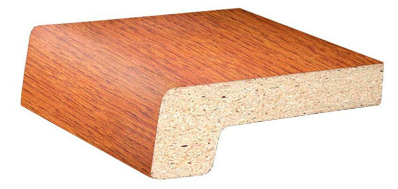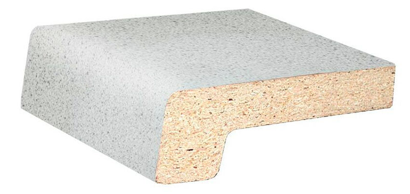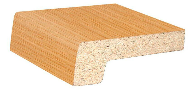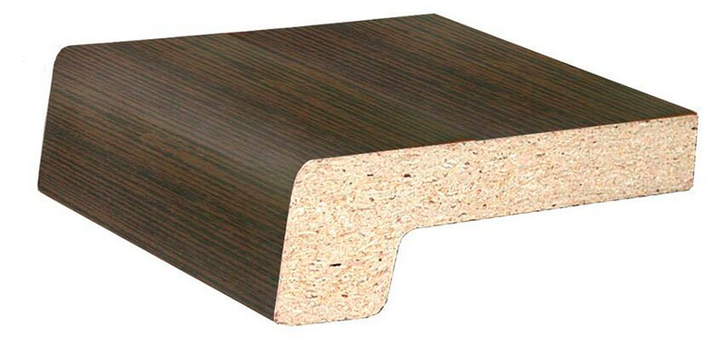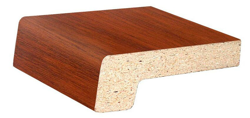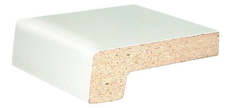 Les appuis de fenêtre en panneaux de particules ou en MDF sont fabriqués en appuyant et en collant de la sciure de bois provenant de l'industrie du bois. En plus du décor, un film plastique ou placage de bois est appliqué sur le matériau pressé et collé. Ces panneaux ont un grand nombre de couleurs et peuvent imiter les surfaces de matériaux naturels. Les panneaux peuvent être coupés à la taille souhaitée, et les extrémités d'un tel rebord de fenêtre sont fermées avec des bouchons spéciaux