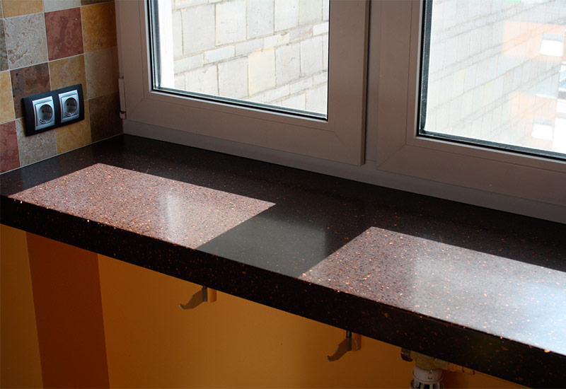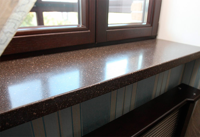 Contrairement à la pierre naturelle, la pierre artificielle n'a pas peur des liquides renversés, des colorants, des contraintes mécaniques et des rayons ultraviolets. Un tel rebord de fenêtre ne nécessite pas de soins particuliers, il est important de ne retenir qu'une chose - il ne peut pas être lavé avec des détergents en poudre, car vous pouvez rayer la surface.