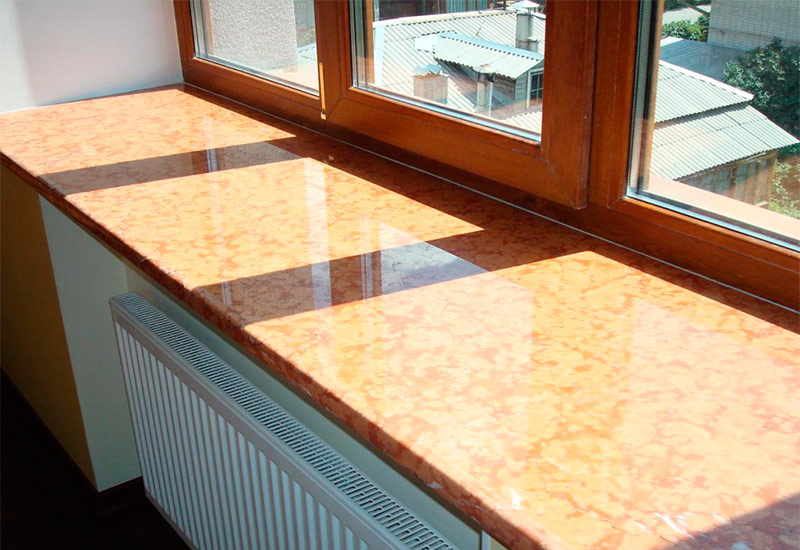 Il est fabriqué à partir de charges minérales et de résines polymères liantes, et divers colorants sont utilisés pour donner de la couleur. Grâce à cette technologie, on obtient un monolithe qui n'est pas inférieur en caractéristiques et en apparence à la pierre naturelle. La viscosité élevée du matériau vous permet d'éliminer complètement le risque de fissures et de copeaux. De plus, le processus d'installation d'un rebord de fenêtre en pierre artificielle est beaucoup plus simple - travailler avec elle ne prend pas beaucoup de temps et son poids est beaucoup moins.