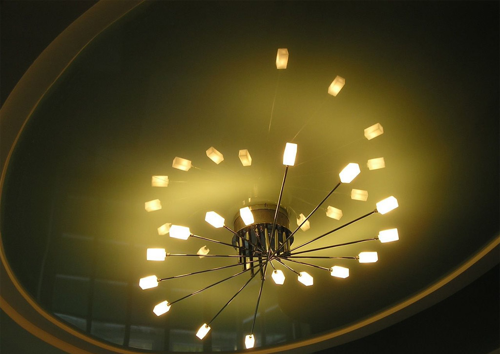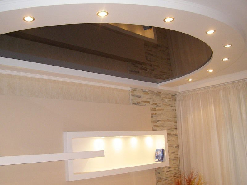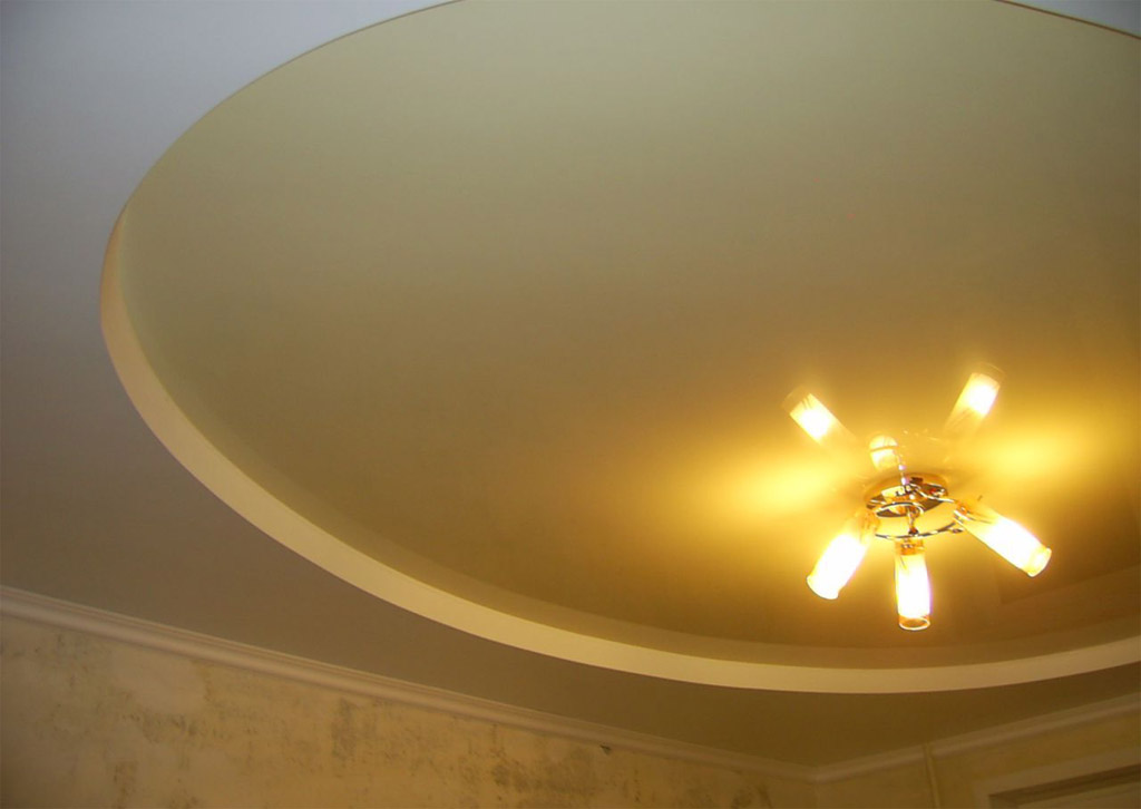 Vous pouvez faire un trou dans la boîte non rectangulaire, mais rond ou ovale. Dans ce cas, le plafond du ciel étoilé sera bon. Il est optimal d'utiliser la boîte avec une hauteur de pièce allant jusqu'à 2,5 m. Une autre option est de faire une «tablette» de cloisons sèches au centre du plafond tendu. Ici, vous pouvez installer un beau lustre.