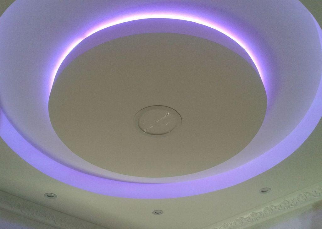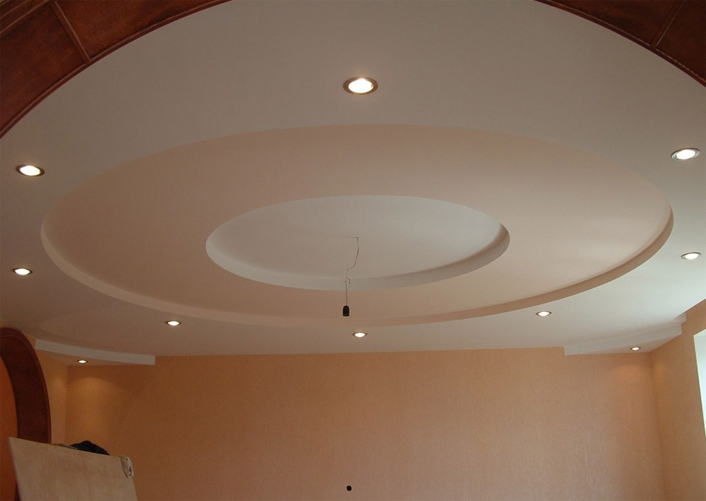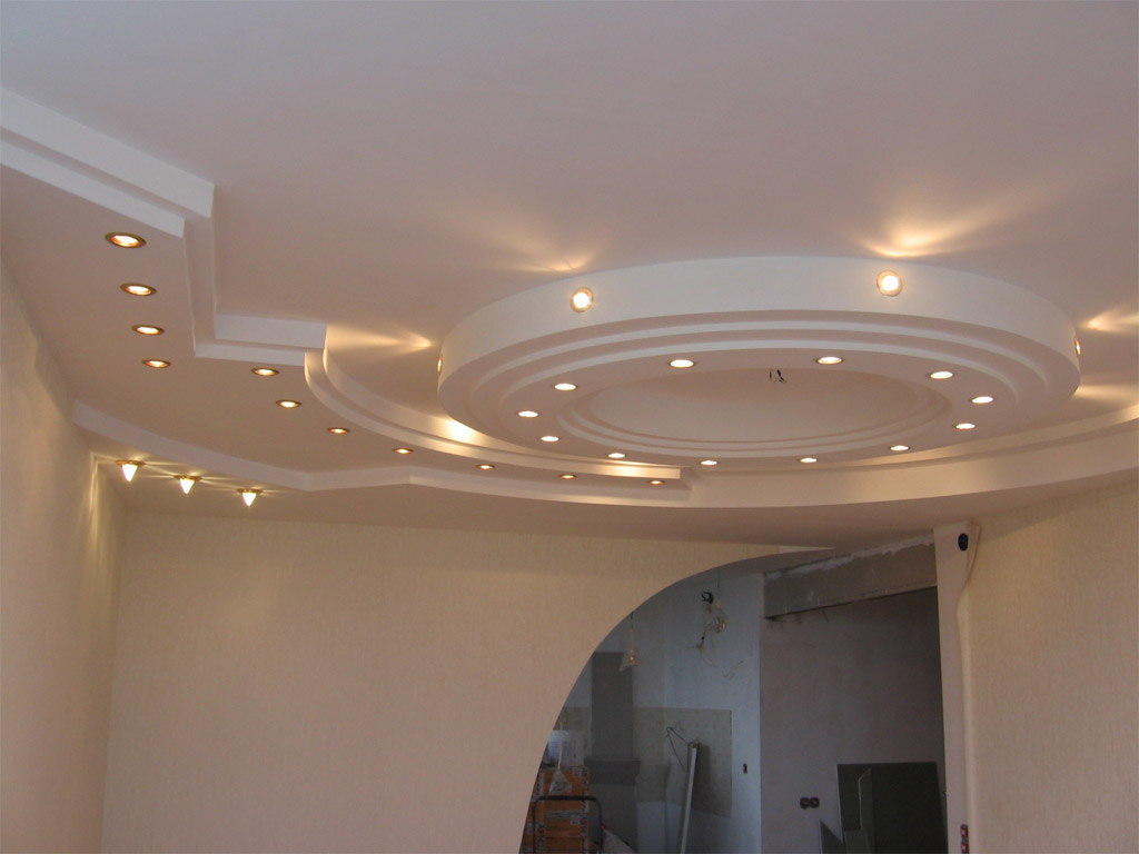 Deux feuilles de carton épais et de plâtre "remplissant" l'intérieur - une composition si simple de ce matériau. Pour rendre la construction durable, les cloisons sèches sont montées sur des profils en métal. Le maître devra bricoler avec un tel plafond, mais le résultat est impressionnant. Pour améliorer l'effet, les luminaires encastrés. Il peut s'agir d'ampoules à incandescence ordinaires, ainsi que de lampes LED, à économie d'énergie ou halogènes.