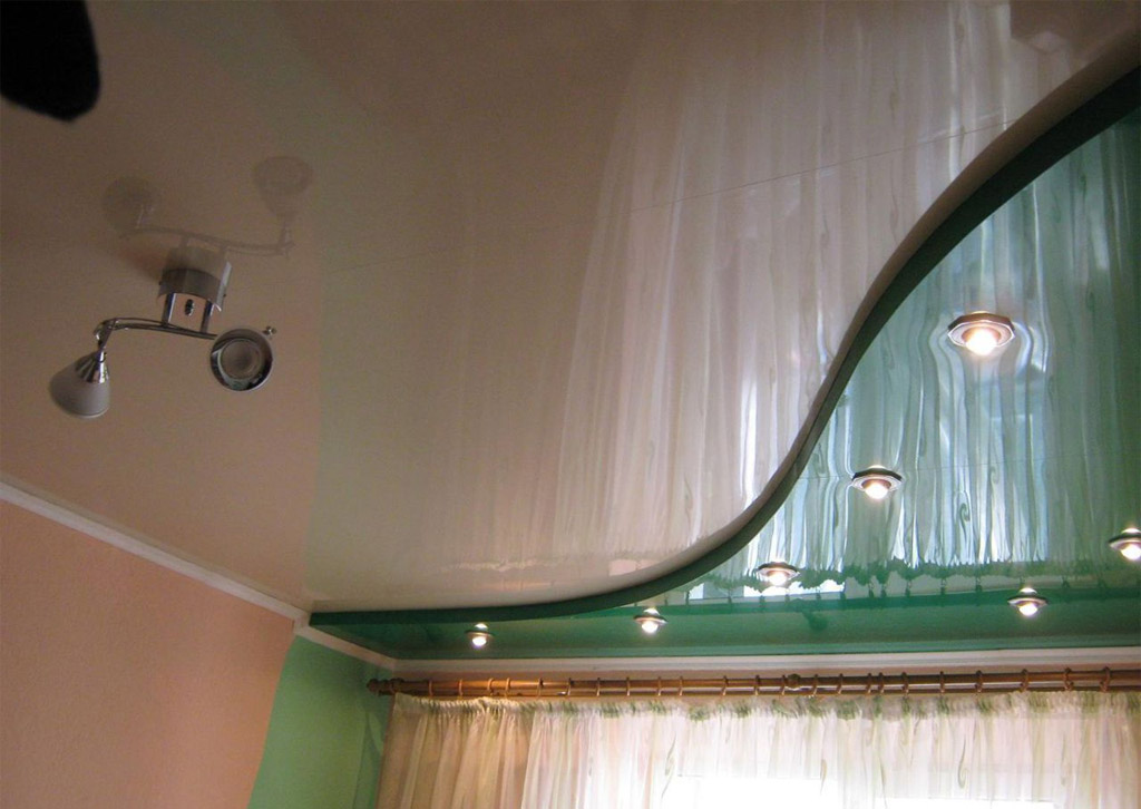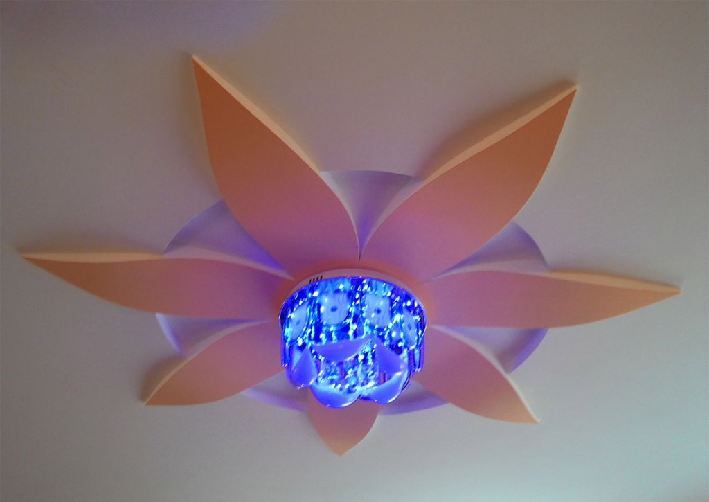 Les feuilles de PVC ont une largeur standard de 1,5 m, elles sont donc soigneusement soudées pour les grandes pièces. Le tissu ne nécessite pas de connexion, car il a une largeur allant jusqu'à 5 m. Lors de l'installation, ils réfléchissent à l'éclairage futur. Pour créer l'effet d'étoiles scintillantes, un générateur de lumière avec un câble à fibre optique peut être intégré.