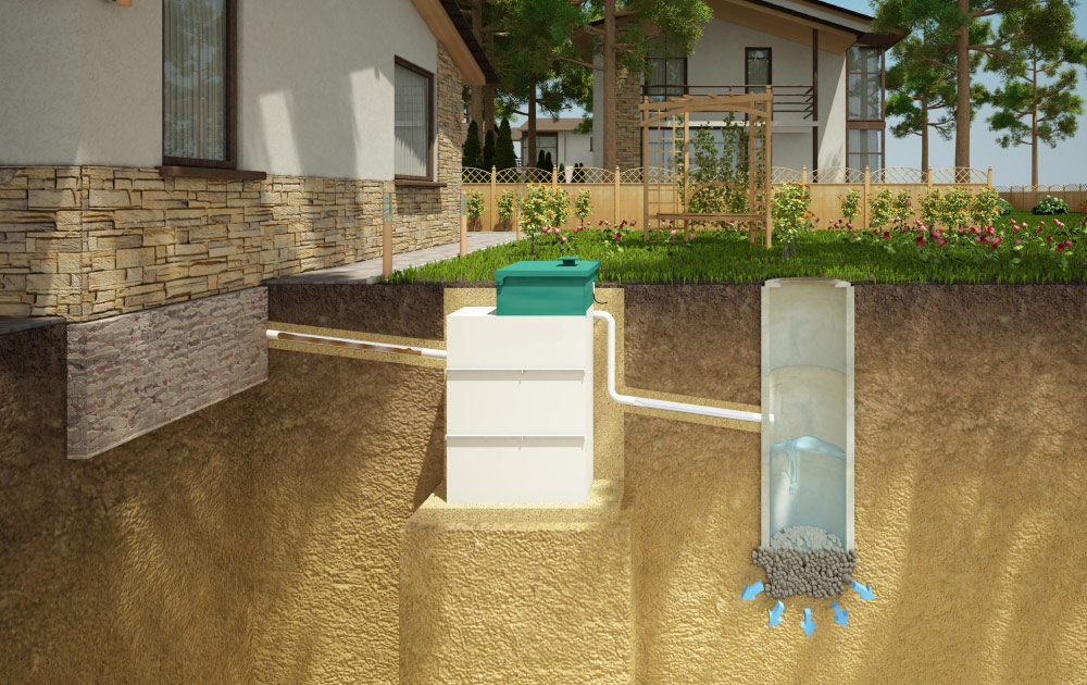 Le dispositif d'une fosse septique avec un infiltrateur. Il existe deux types de fosses septiques avec infiltrateur: avec un puits intermédiaire situé entre la fosse septique et l'infiltrateur et sans celui-ci.