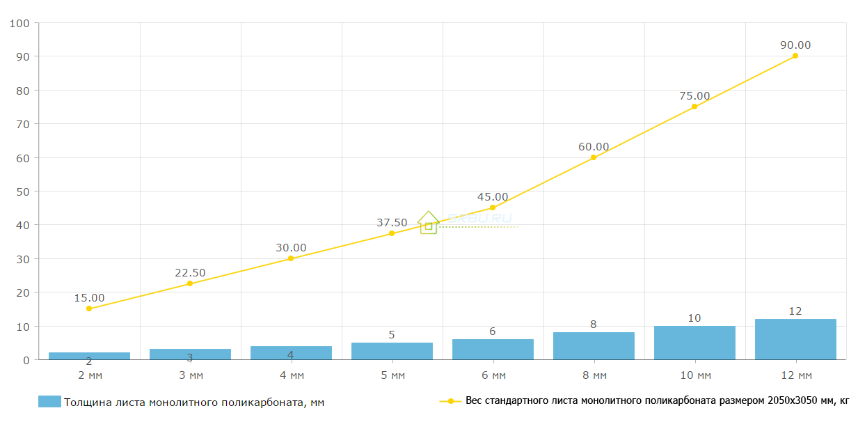 Dépendance du poids d'une feuille standard de polycarbonate monolithique, taille 2050x3050 mm, sur son épaisseur.