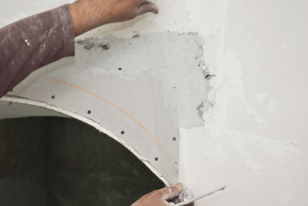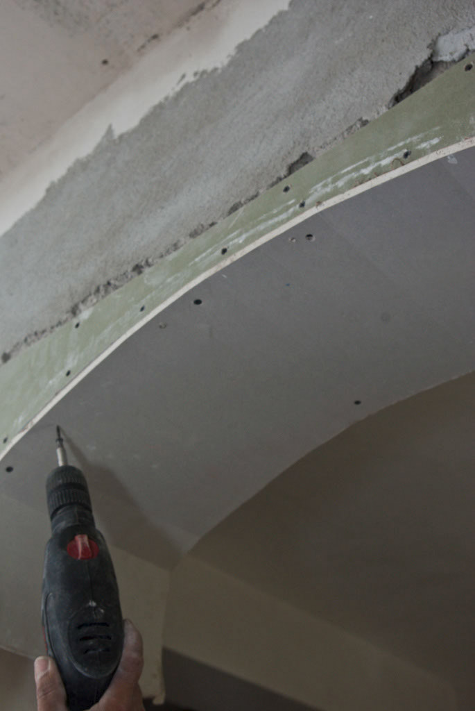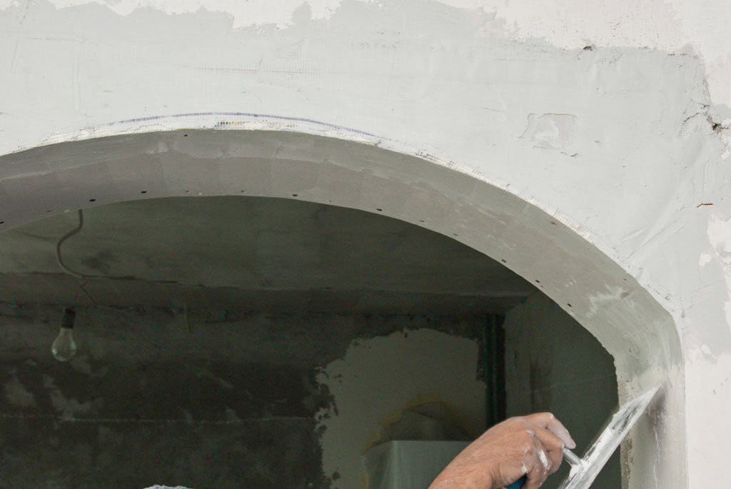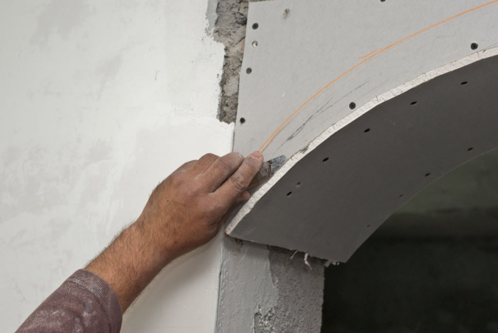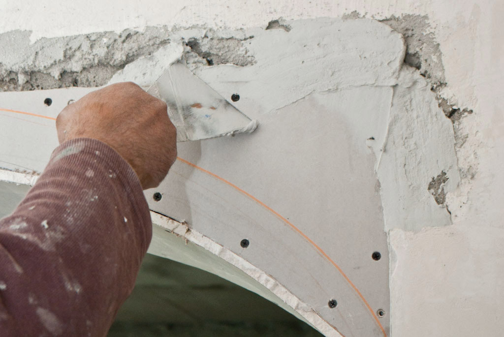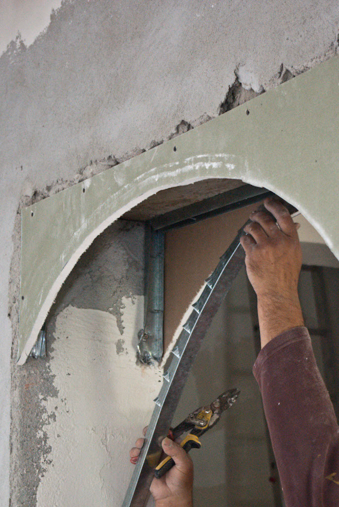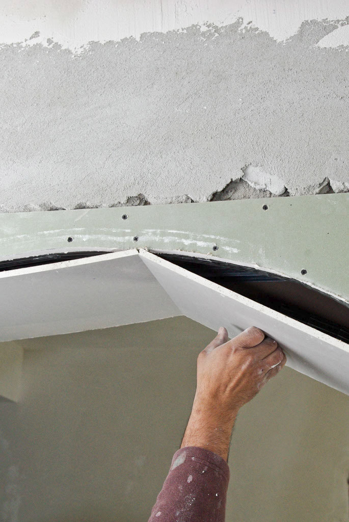 Finition des bords inférieurs de l'arc de cloison sèche.