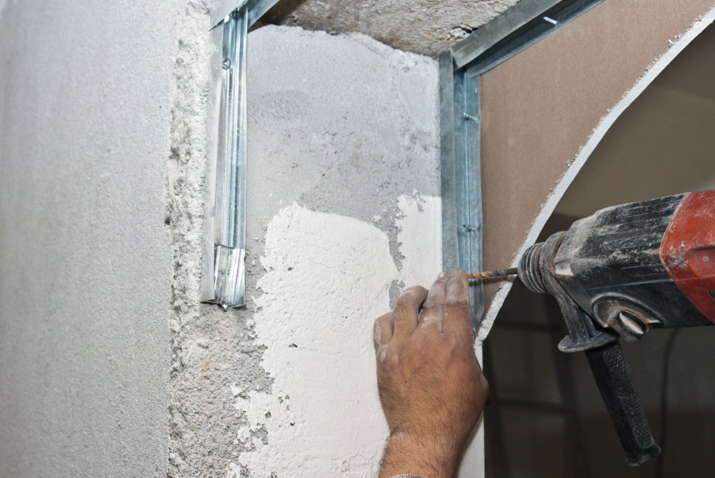 Fixation de l'arche de cloison sèche à un profil métallique incurvé.