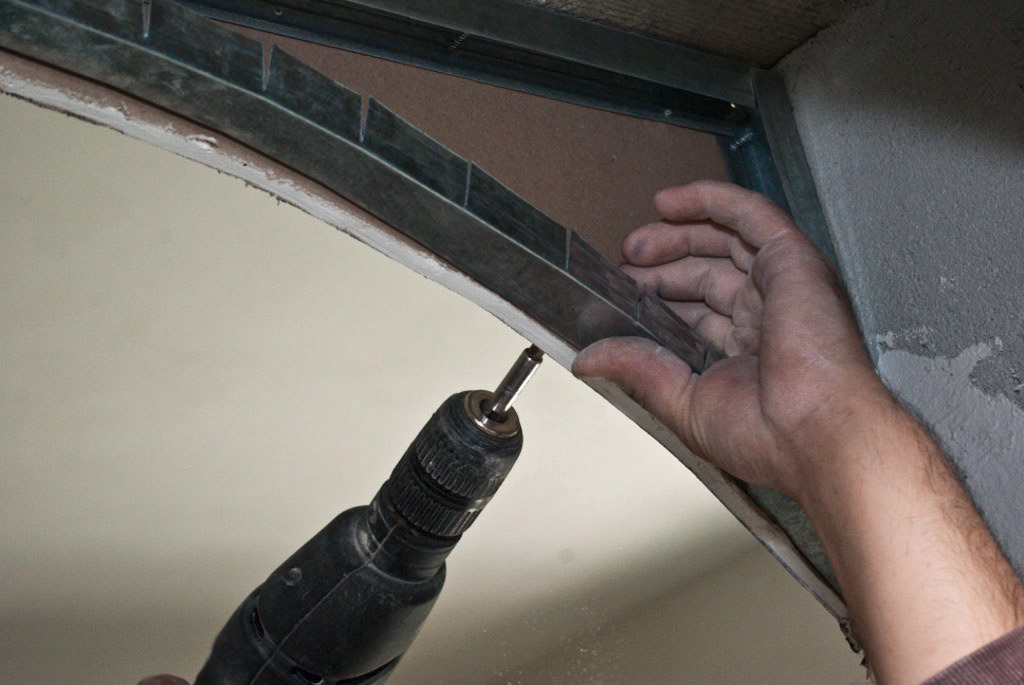La prochaine étape des travaux consiste à fixer le profilé métallique incurvé le long du bord de l'arc de cloison sèche pour augmenter la rigidité de la structure.