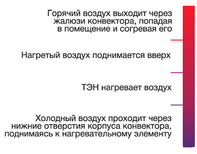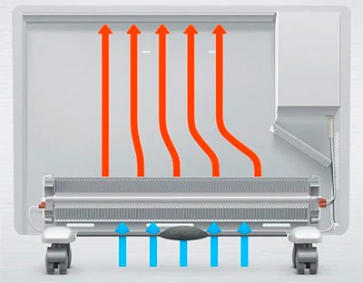 Les appareils électriques de ce type ont un élément chauffant chauffé à une température élevée, qui dégage de la chaleur aux flux d'air montant le long de ses parois. Lors du fonctionnement d'un tel appareil, il y a une circulation assez intense des masses d'air, ce qui conduit à un chauffage rapide de la pièce.