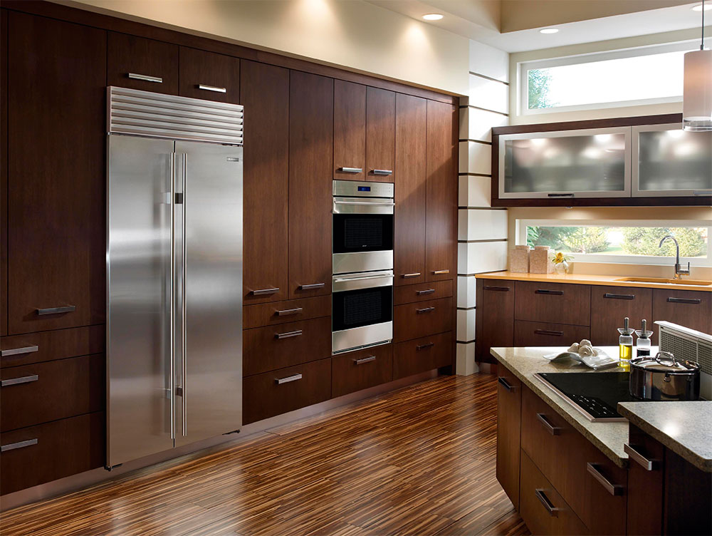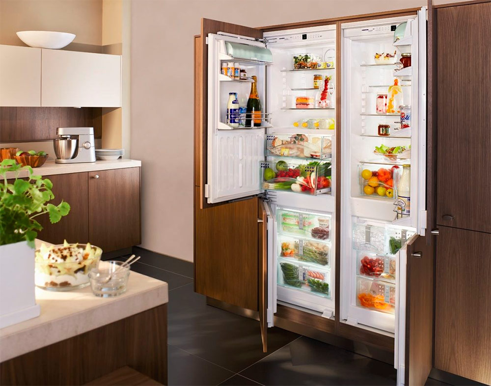 Les réfrigérateurs côte à côte autoportants attirent l'attention des visiteurs, leur design doit donc être sélectionné en tenant compte de l'intérieur de la cuisine. Pour les modèles intégrés, ce problème n'est pas si pertinent. Ils peuvent être complètement cachés à l'intérieur de la cuisine ou n'ont que des portes en vue.