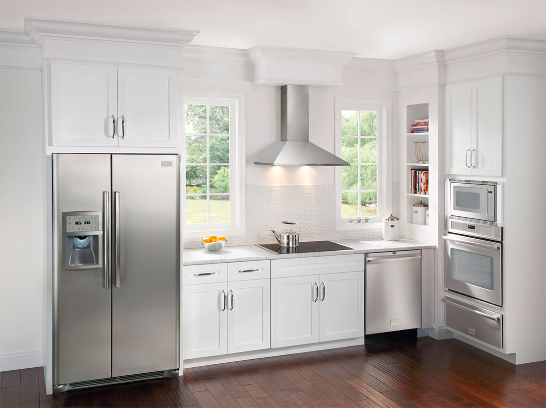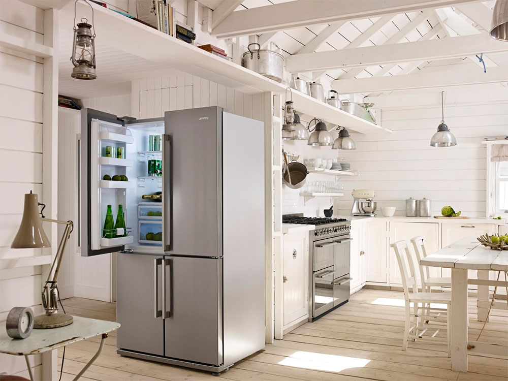 Le réfrigérateur côte à côte est un détail très visible de l'intérieur de la cuisine.Il doit être en harmonie avec le reste des appareils électroménagers, du mobilier et de la décoration. Les appareils universels sont blancs ou beiges. Les empreintes de mains n'y sont pas visibles. Ils sont faciles à nettoyer de la poussière et de la contamination accidentelle. Ils sont souvent stylisés comme des appareils classiques.