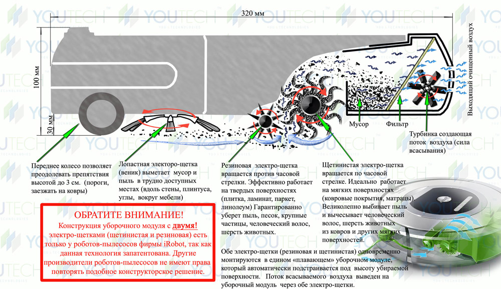 Le robot aspirateur élimine les gros débris avec une brosse spéciale (dont il en a un ou deux dans un ensemble). Pour atteindre des endroits inaccessibles (par exemple, près des pieds de meubles, dans les coins, près du mur), il a de petites brosses latérales en magasin.